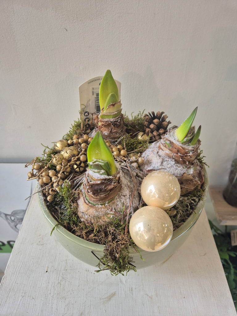 Decorative raised green ceramic planter with 3 white amaryllis bulbs and festive decorations. Perfect table centre piece for this festive period.
