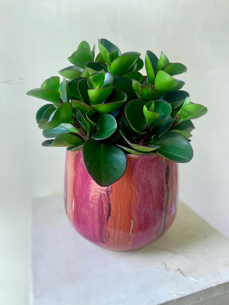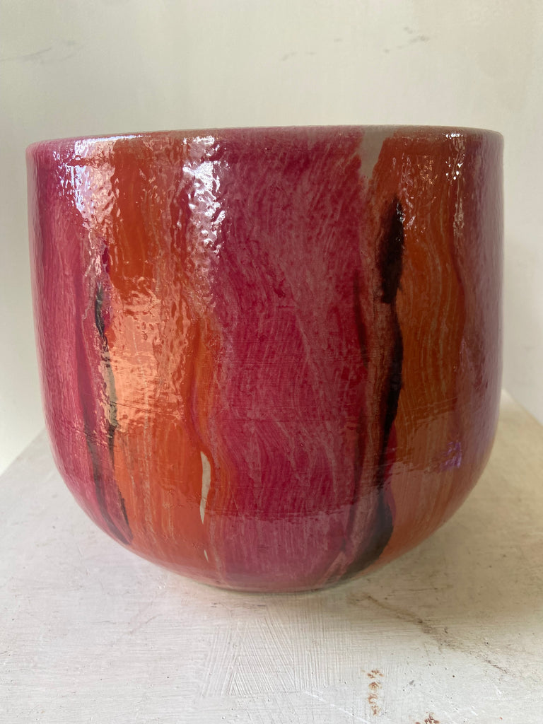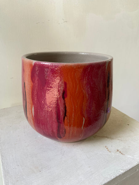 A ceramic pot with shades of pink and cerise in a hand painted vertical design