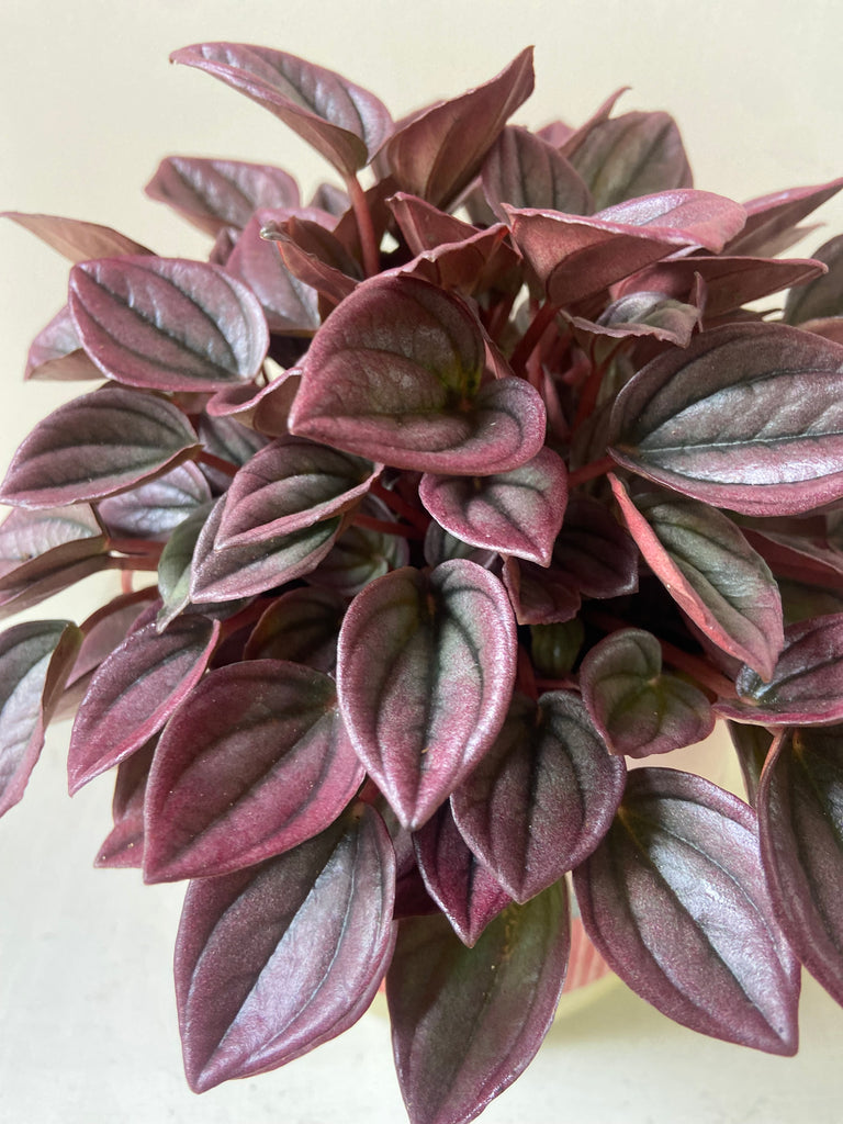 Compact, low growing houseplant native to Brazil. Known for its deeply wrinkled, heart shaped leaves with pinkish red and purple hues. It’s an easy to care for Peperomia, pet safe that requires bright indirect light, well draining soil and only needs watering when the top soil is dry to the touch. Keep away from heat sources like radiators.