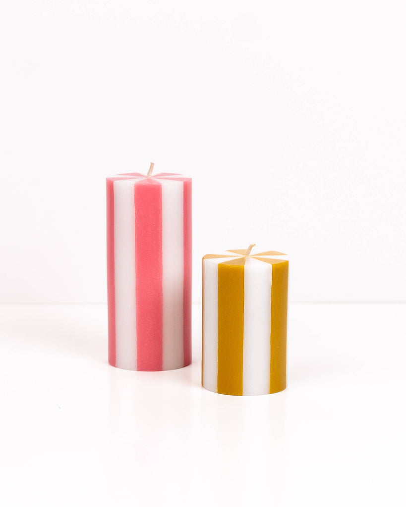 Brighten your home with the Stripe Pillar Candles. Each candle is made from 100% stearin wax for a clean, long-lasting burn. Each colour is individually hand poured creating unique and distinct stripes. The colours are carefully chosen to bring fun and elevate your home's interior.